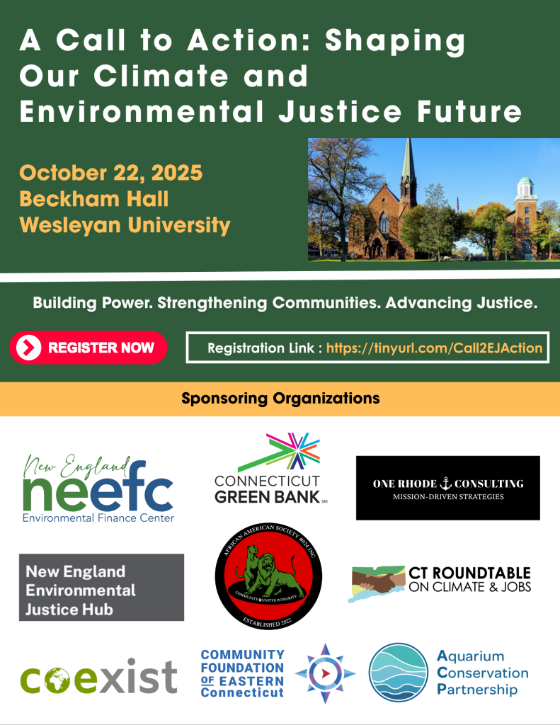 Join us for a full-day gathering that connects grassroots organizers, community leaders, nonprofits, and funders working across housing, food and farming, clean energy, and public health. Together, we will share knowledge, build coalitions, and take bold steps toward environmental justice. This event is proudly supported by the Connecticut Roundtable on Climate and Jobs, New England Environmental Finance Center, Aquarium Conservation Partnership, the African American Society, Bailey College of the Enviroment at Wesleyan University, as well as Local Environmental Groups, and Community Partners whose commitment to equity and resilience makes this Convening possible.