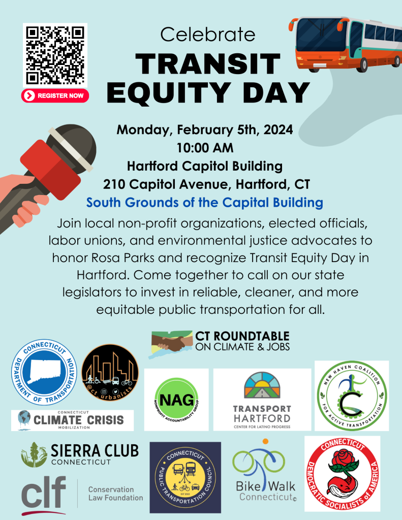 Join the Connecticut Roundtable On Climate and Jobs alongside Transport Hartford, CTDOT, CT Sierra Club, Bike Walk CT, NAG, CT Climate Crisis Mobilization, the Conservation Law Foundation, New Haven Coalition For Active Transportation, CT Public Transportation Council, and other local non-profit organizations, elected officials, labor unions, and environmental justice advocates to honor Rosa Parks and recognize Transit Equity Day at the State Capitol Building in Hartford, CT.