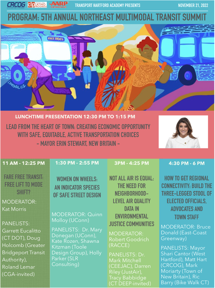 The Transport Hartford Academy program at the Center for Latino Progress will host the fifth Northeast Multimodal Transit Summit online on November 21nd, from 11:00 am to 6 pm pm EST. We need your support to send a clear message that multimodal transportation and transit are critical for creating jobs across an economically vibrant, connected, and sustainable region. The Summit will bring together transportation professionals, community representatives, academics, activists and officials with the goal of helping decision-makers plan a future that meets the needs of our society. We urgently need to transition to sustainable modes of transportation which must be environmentally sustainable, equitable, and accessible. This year’s focus is on “connecting” people and ideas in the Northeast region.