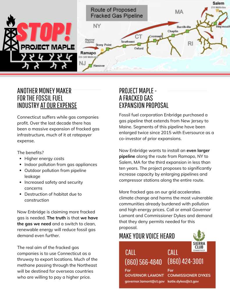 Project Maple is a major expansion being proposed by Enbridge to their fracked-gas pipeline that runs from New Jersey to Massachusetts. Enbridge is seeking to increase capacity of this line by up to 500,000 Dekatherms/day at the Ramapo, NY receipt point, and up to 250,000 Dekatherms/day at the Salem, MA receipt point.